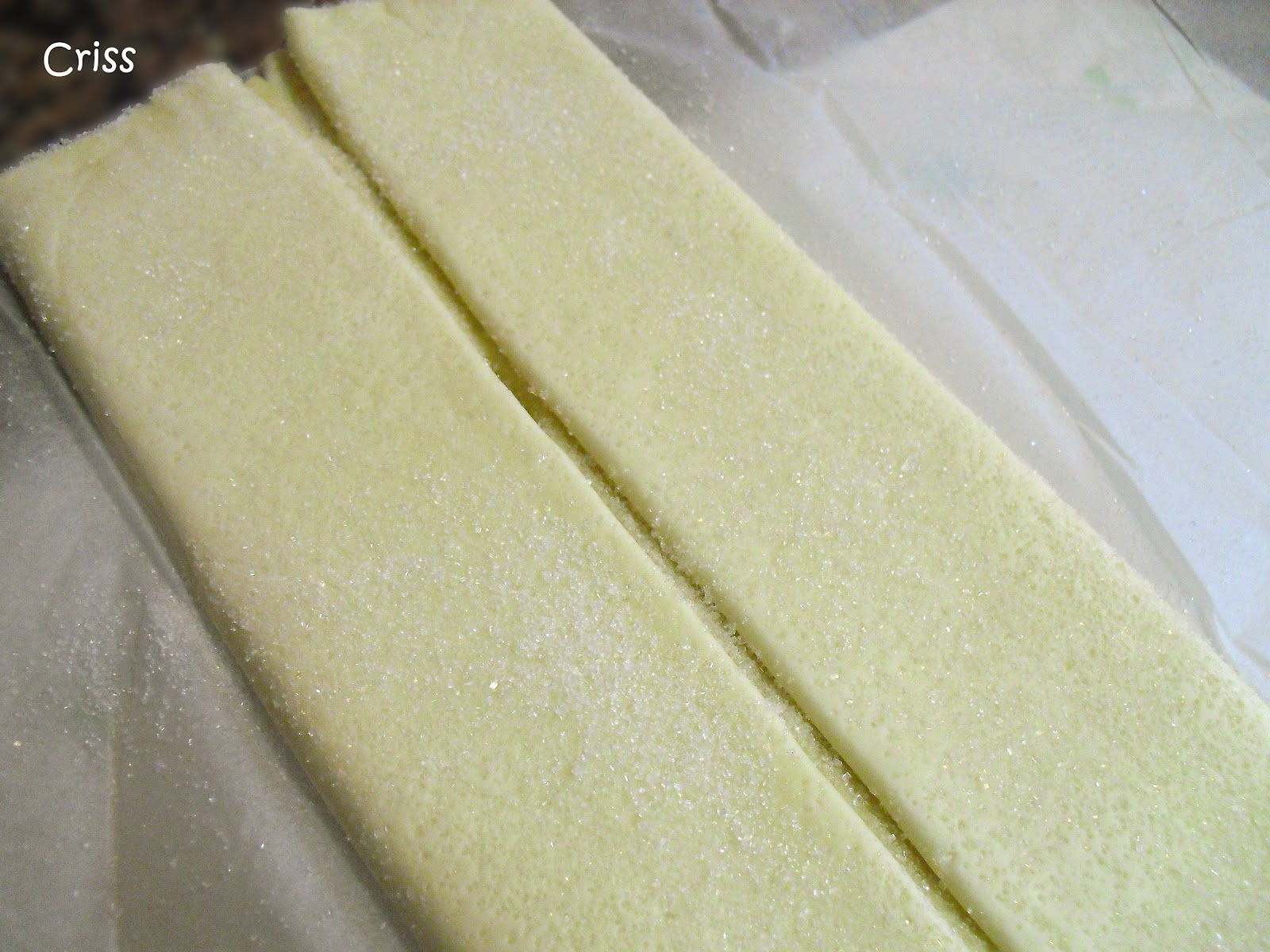 Abrimos el hojaldre y lo extendemos, espolvoreamos con azúcar y vamos doblando y espolvoreando, en las imágenes lo veréis bien como se hace.